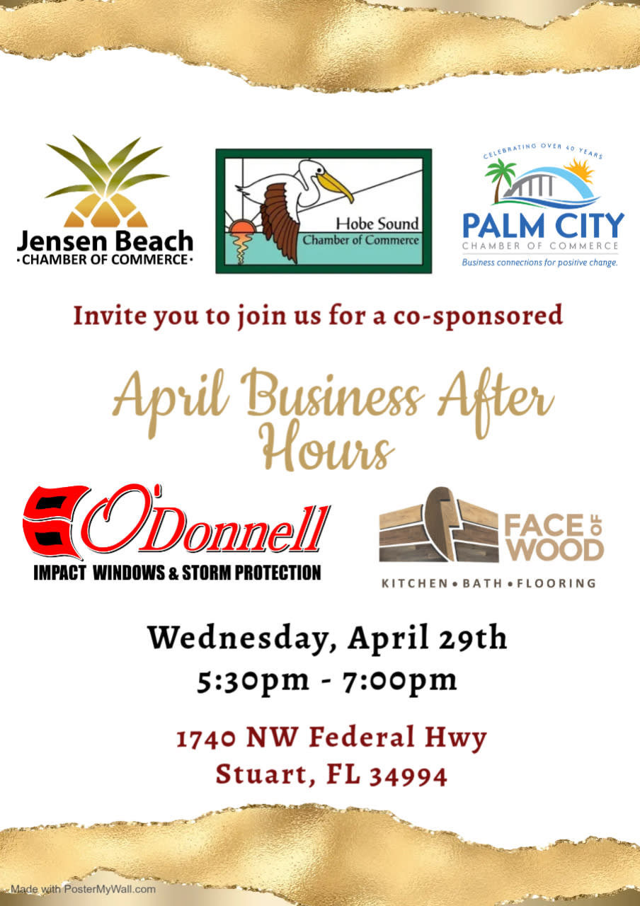 Join us for a joint April Business After Hours with the Hobe Sound Chamber, Jensen Beach Chamber and Palm City Chamber. The event is co-hosted by O'Donnell Impact Windows and Storm Protection and Face of Wood Flooring at their Stuart location. Both companies look forward to welcoming you while checking out their beautiful showrooms and learning what each has to offer. Join us for a fun night out with fellow members enjoying food, drinks, conversation and collaboration with the three chambers.