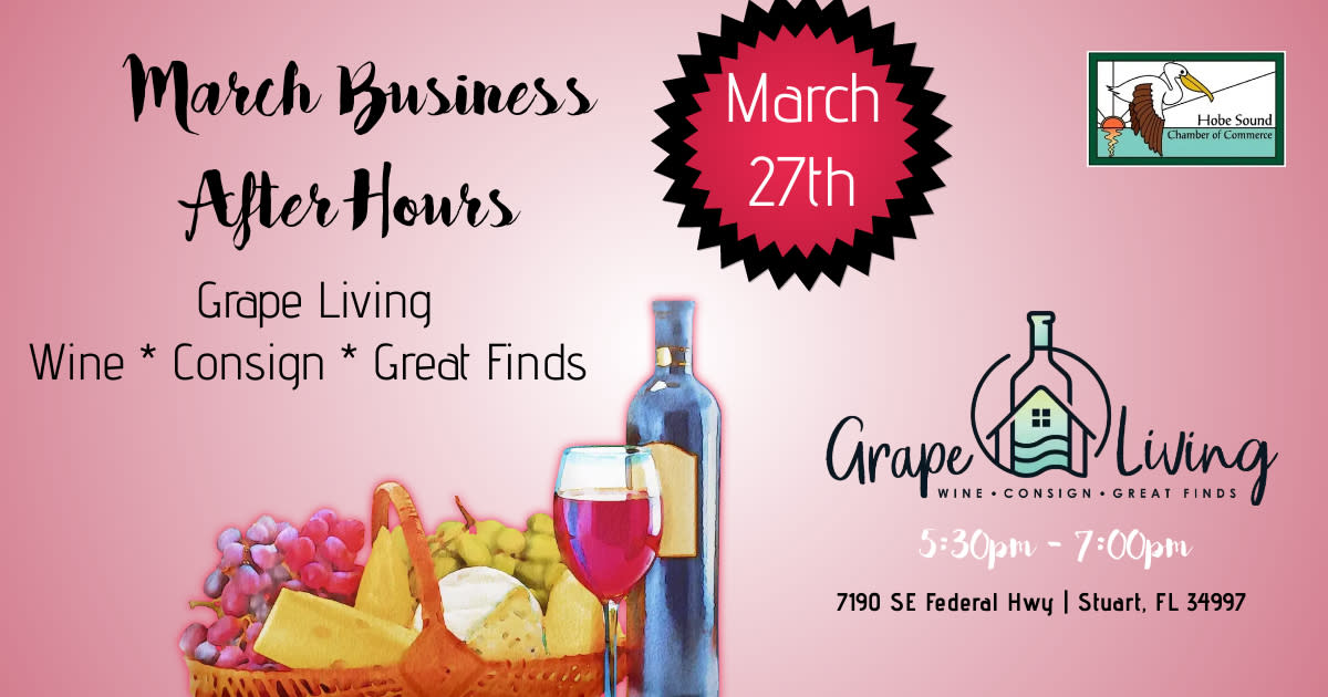 Join us for our March Business After Hours & Ribbon Cutting at the new Grape Living Wine & Consign gallery from the owners of The Grove Cucina & Wine Bar. The new owners refreshment on this treasured local consignment store is to be where elegance and value in home decor meets the world of sommelier curated, value driven and exclusive offerings in fine wines. The Grape Living boutique is located in Stuart, FL and is a haven for those who appreciate the finer things in life - be it a beautifully crafted piece of furniture or a bottle of exquisite wine. Join us for a fun night celebrating this new boutique while enjoying lite bites, drinks and networking. Let's all come out and support our members Jen and Luis Reyneri and their new addition!
