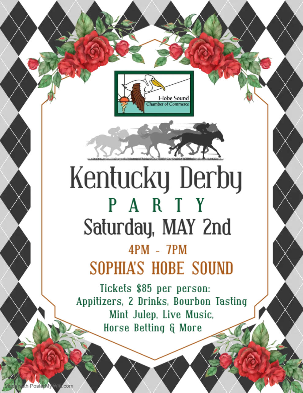 Join us for the best Kentucky Derby Party in town! Guests will don their best derby attire while enjoying bourbon tastings, mint juleps, delicious hors d’oeuvres and more. Join us for a fun night of networking, live music, a Best Dressed & Hat contest and horse betting. Attendees will cheer on their favorite horse during the viewing of the live Kentucky Derby race ! Festivities will take place outside on the terrace at Sophia's and you must have a ticket to enter. For more information email lainey@hobesound.org $85 a ticket, space is limited and you must be 21 years or older.
