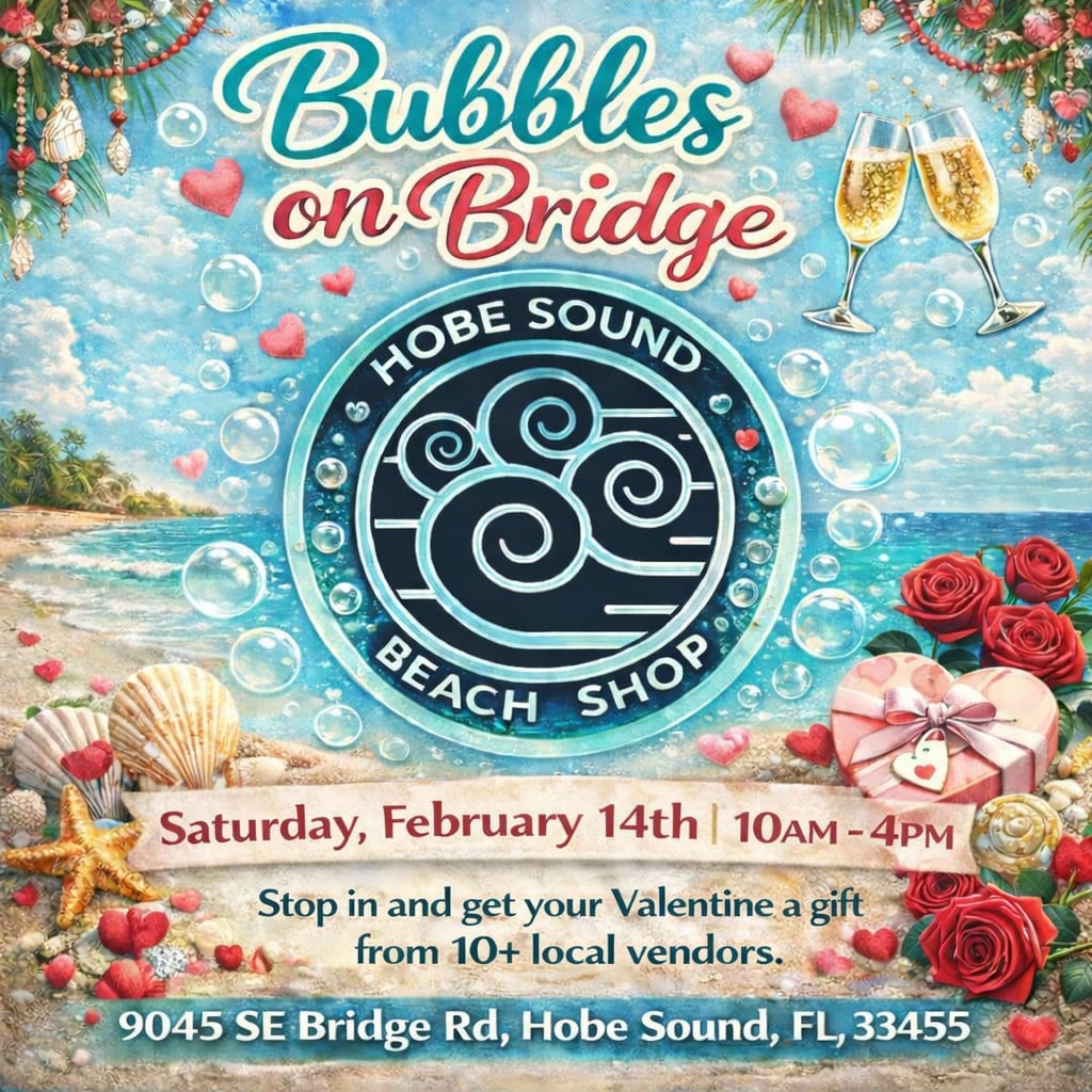 We are pleased to announce our event, Bubbles on Bridge Rd, which will be held at the Hobe Sound Beach Shop on February 14th from 10 - 4pm.
