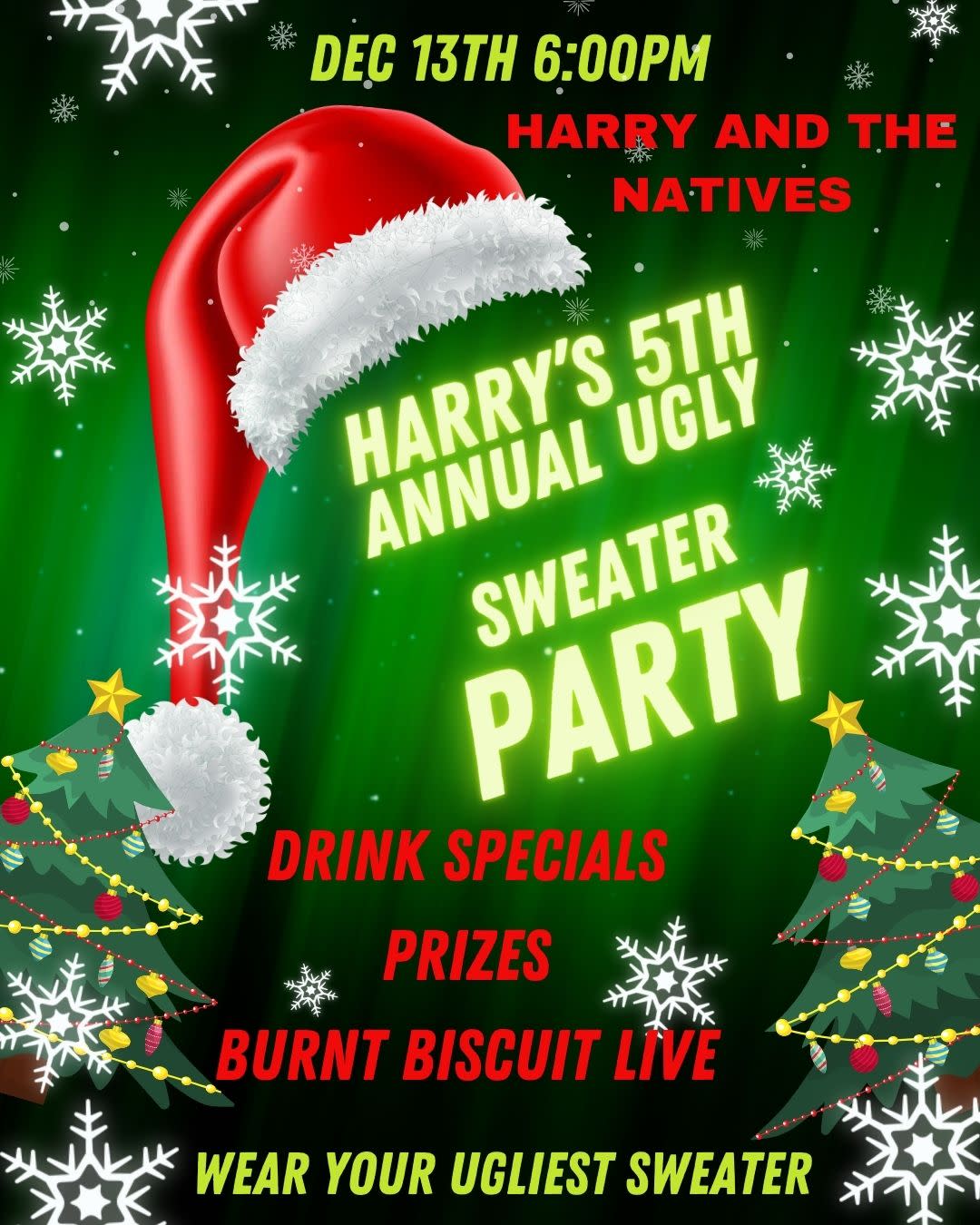 🎄🎶 Harry’s 5th Annual Ugly Sweater Party! 🎶🎄 📅 Friday, December 13th • 6:00–9:00pm 🎵 Live Music with Burnt Biscuit 👕 Ugly Sweater Contest – show off your wildest holiday gear! 🏆 Prizes for the Winners 🍹 Food & Drink Specials all night long It’s the most festive (and ugliest 😉) party of the year — grab your friends, bring the holiday cheer, and let’s make it a night to remember at the tiki! 🌴✨ #HarrysNatives #UglySweaterParty #HobeSound #LiveMusic #HolidayFun #Prizes