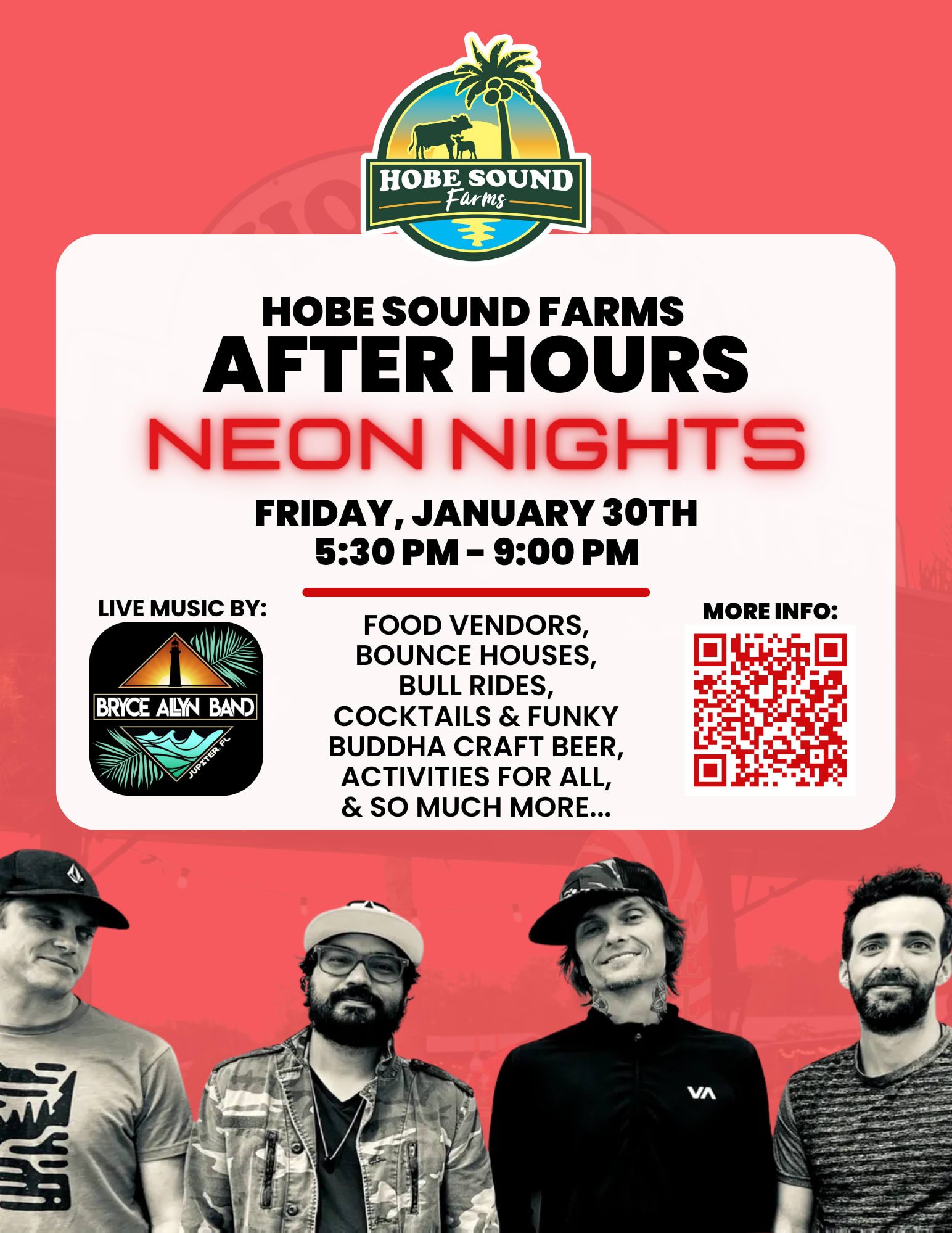 Experience Hobe Sound Farms After Hours: Neon Nights—a lively night on the farm featuring live music from The Bryce Allyn Band, Glow-in-the-Dark sling shot at the Bouquet Bunker, food trucks, animal encounters, and nighttime hayride tours around the farm. Sip on Funky Buddha craft beer or cocktails from our full bar! January 30th 5:30pm - 9pm https://hobesoundfarms.com/hsf-after-hours/ Purchase Tickets Today! $10 Pre-Sale Tickets (Kids under 5 free) $15 Tickets Day-of https://form.jotform.com/252054940380150Images